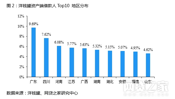 随着人们生活水平的提高,蓝领人群收入不断提高,消费需求崛起。但市场对这部分人的资金供给短缺明显。洋钱罐资产端下沉,为这部分传统金融未覆盖人群提供资金撮合服务,目前平台借款人主要是三四线城市的蓝领人群,其职业构成以餐饮业、制造业、服务业为主,比如饭店服务员、工厂的工人等,也体现了洋钱罐实践普惠金融惠及群体的广泛性。截至2019年2月底,洋钱罐累计服务了近千万借款人,且借款人地理区域分布广而分散。其中,借款金额占比最高的地区是广东省,占比为9.69%;借款金额占比位居第二的是西部的四川省,占比为7.62%;位居第三的是中部的河南省,占比为6.08%。前十大地区的借款金额合计占比为59.90%。借款人分布符合中国人口分布特点,无区域性集中风险。