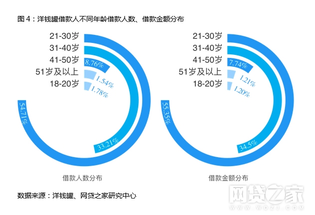 洋钱罐借款人中,90后、80后是主力军,这部分人群创收、消费能力双高。其中,21岁-30岁的借款人数占比最高为54.71%,借款金额占比为55.35%;31-40岁的借款人数及借款金额占比分别为33.21%、34.50%。