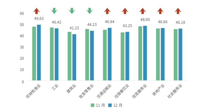 分行业来看,12月,九大行业经营景气度指数呈6升3降态势。年末市场肉类、生鲜等农产品需求集中释放,物流运输需求旺盛,带动农林牧渔业和交通运输业经营活跃度提升。社区服务、维修、家政等服务需求季节性上升,社会服务业经营活力进一步增强。新旧动能协同发力,信息服务业在波动中保持积极态势,房地产领域景气度也有所改善。工业、建筑业和批发零售业经营景气度有所下降。
