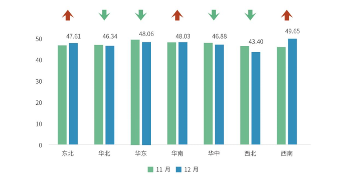 分区域来看,七大区域经营景气度指数呈现3升4降态势。其中,东北、华南、西南地区指数有所上升,分别为47.61、48.03和49.65点,华北、华东、华中和西北地区指数有所下降,分别为46.34、48.06、46.88和43.40点。
