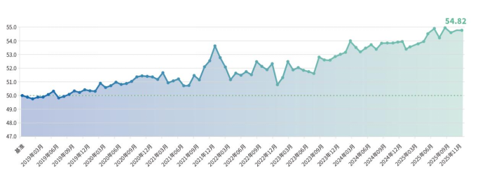 分维度来看,12月,融资景气度指数为54.82点,较11月下降0.01点。信贷规模持续增长,融资成本维持在历史低位,信贷结构优化趋势显著。中国人民银行数据显示,2025年全年新增贷款16.27万亿元,适度宽松的货币政策发力显效,企业和居民有效信贷需求持续释放。其中,企(事)业单位贷款新增15.47万亿元,金融服务精准对接了企业需求,科技、绿色、普惠、养老产业和数字经济产业等重点领域贷款都保持了两位数增长。