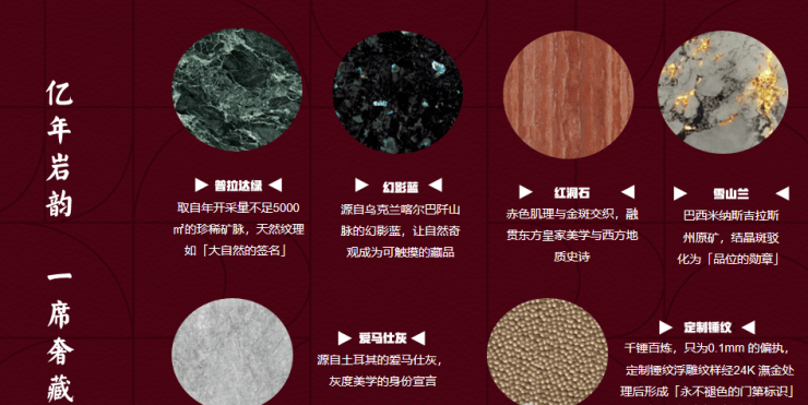甄选质地坚硬且造价极高的蓝棕石材作为外立面主要材料,经久耐用且易养护,具备高承载性、保温隔热及强抗压能力,多用于豪华别墅、星级酒店、公共建筑等高规格建筑立面。